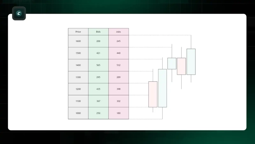 На примере ниже показано, как работает рыночный баланс. На каждом уровне объем ордеров на покупку (Bids) и продажу (Asks) почти равный, что поддерживает равновесие и позволяет рынку плавно двигаться.