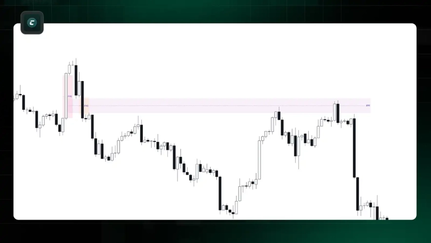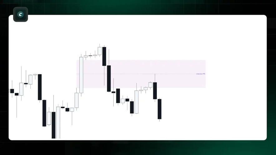 - Если восходящий FVG не удерживает цену и пробивается, он становится I-FVG, что может поддержать цену с другой стороны.