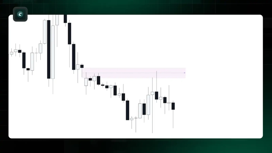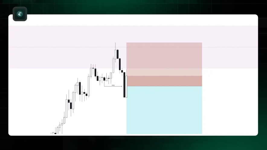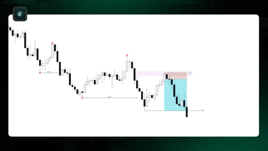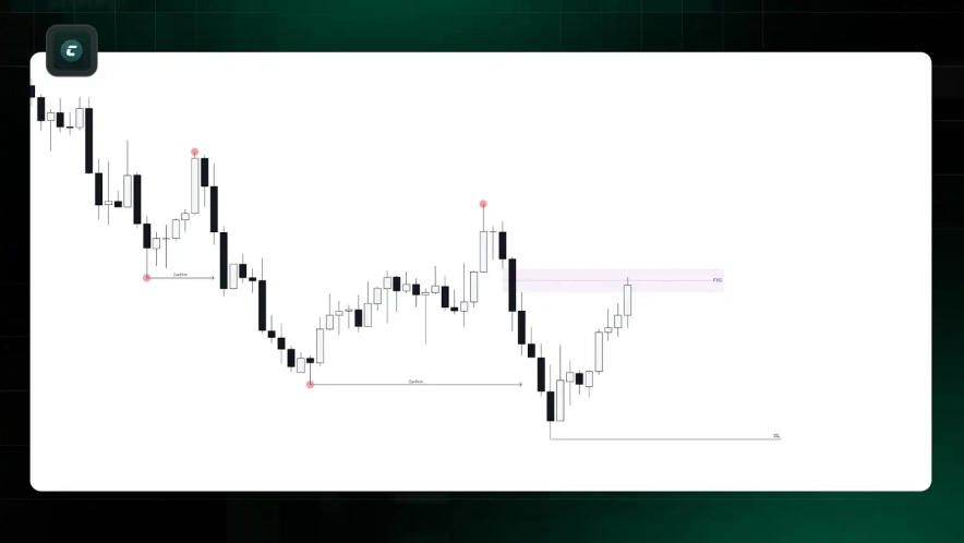- В этом нисходящем импульсе мы идентифицируем нисходящий FVG. Согласно концепции Premium Discount, эта зона FVG находится в верхней части топ-то в Premium, что делает ее сильной зоной для потенциального ретеста.