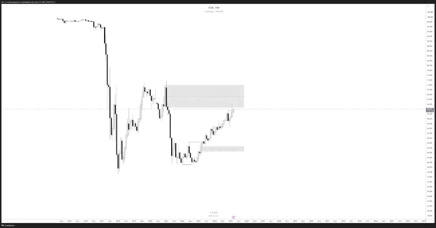 BTC.D: если смотреть с точки зрения месячного периода, то индекс находится в зоне сопротивления и вопрос времени когда будет получена реакция и начало нисходящего движения.