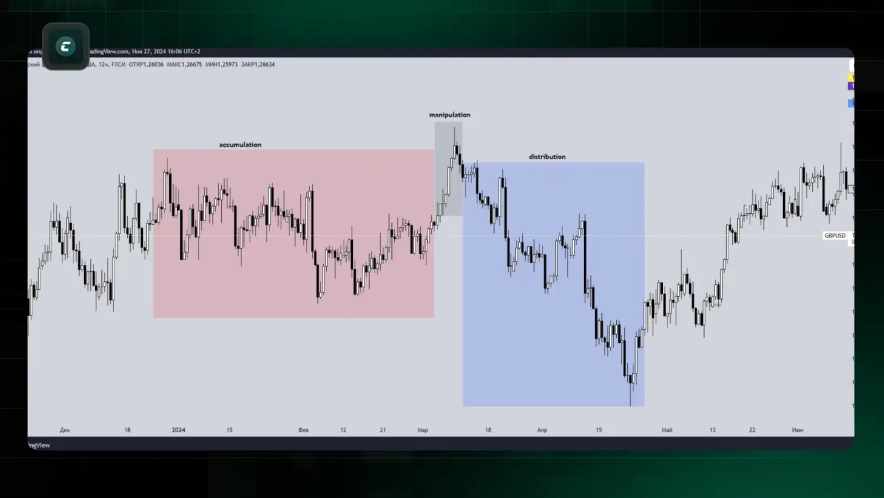 - Accumulation (накопление): формирование позиций крупных игроков.