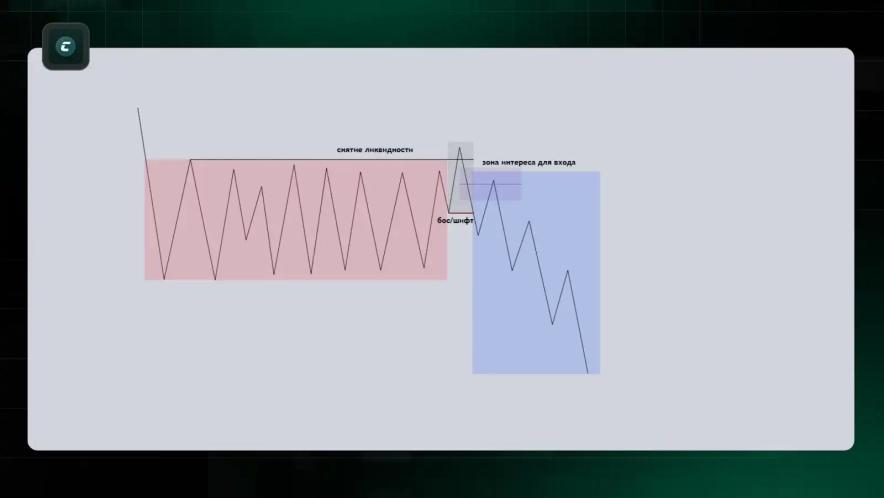 - Manipulation (манипуляция): искусственное движение цены для устранения мелких участников и создания ликвидности.