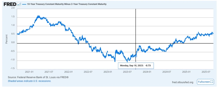 Рынок облигаций сигнализировал повышенные риски через инверсию 2Y-10Y (T10Y2Y уходит в минус) – классический опережающий индикатор замедления.