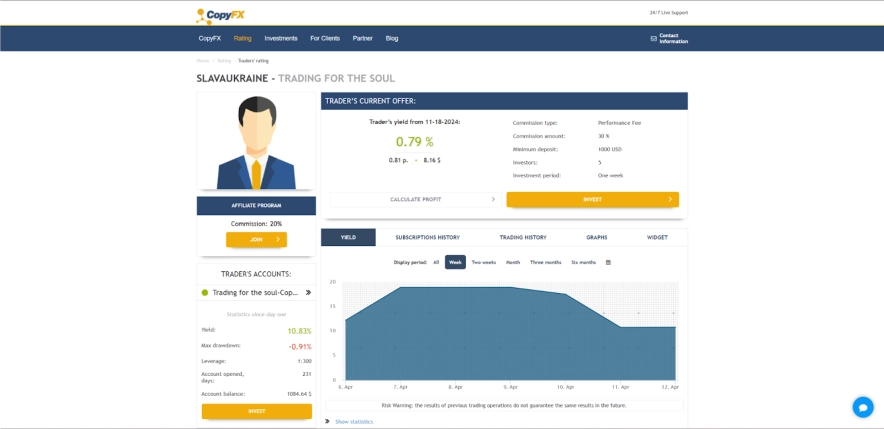 После нажатия на имя трейдера в списке рейтинга, вы попадаете на его личную страницу - именно здесь сосредоточена основная аналитика и условия сотрудничества. Эта информация позволяет сделать вывод не только о торговых результатах, но и о стиле работы трейдера, уровне риска и подходах к управлению капиталом.
