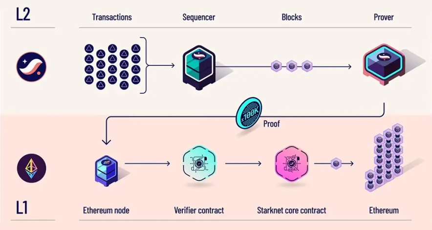 Starknet достигает безопасных транзакций с низкой стоимостью и высокой производительностью за счет использования криптографической системы доказательств STARK. Сеть StarkNet объединяет транзакции в доказательство STARK, которое было вычислено вне основной сети, таким образом снижая нагрузку с нее.