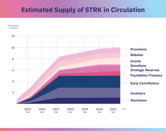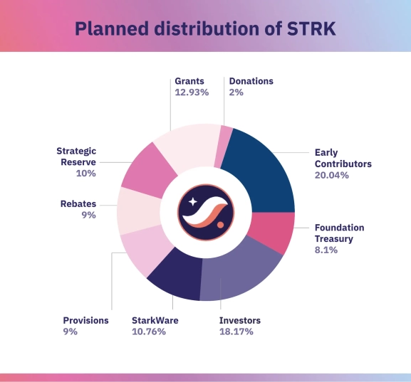 - Гранты: 12,93% — токены на гранты для исследований и работ, связанных с разработкой, тестированием, внедрением и поддержкой протокола Starknet.