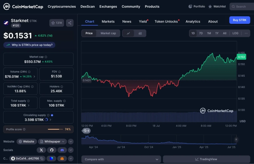 На момент июля 2025 года цена STRK составляет $0.1531. Рыночная капитализация токена достигла $550.57 млн, а суточный объем торгов – $76.01 млн.