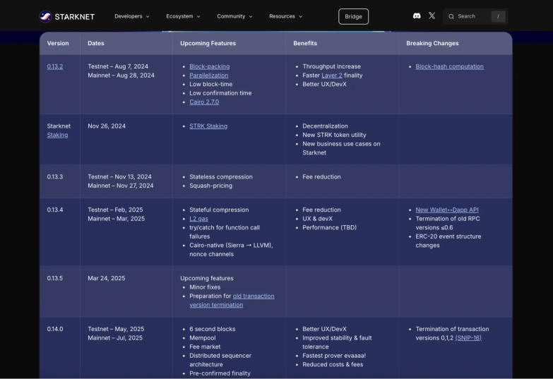 На данный момент Starknet находится в фазе подготовки к выпуску версии 0.14.0, которая находится в тестнете с мая и ожидается в mainnet в июле 2025 года. Это обновление станет важным шагом для масштабирования и повышения стабильности сети.