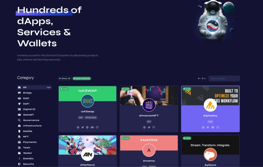 Экосистема StarkNet – это совокупность проектов, которые разрабатываются и работают на сети StarkNet. Экосистема StarkNet быстро растет и развивается, и в ней уже представлены проекты из различных областей, включая децентрализованные приложения (dApps), инфраструктуру Ethereum и финансовые приложения. Проект активно развивается и имеет более 200 приложений и проектов в своей экосистеме. Очень хорошие показатели работы команды и воплощение их амбиций.