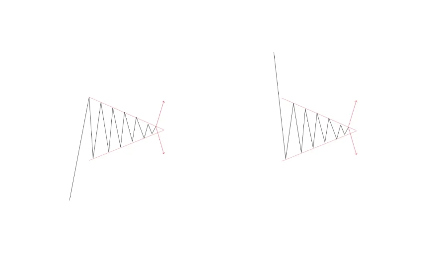 Эти фигуры отображают периоды, когда рынок набирает позицию, а покупатели и продавцы находятся во временном балансе. Они не дают четкой подсказки на направление, пока не произойдет пробой.