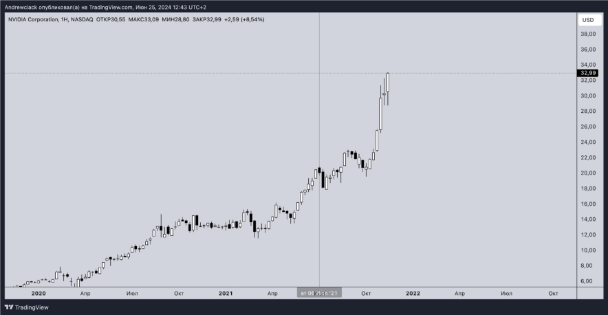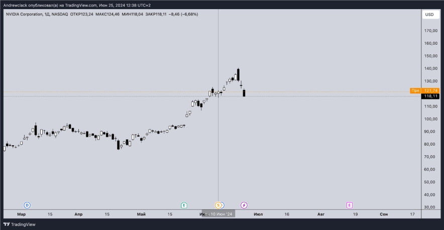 7 июня 2024 года, компания Nvidia объявила о своем решении провести сплит акций NVDA в соотношении 10 к 1. Этот событийный шаг был запланирован после закрытия торгов в США. По итогам сплита каждая акция Nvidia была разделена на 10 новых акций, что привело к соответствующему уменьшению цены акций на десять раз.