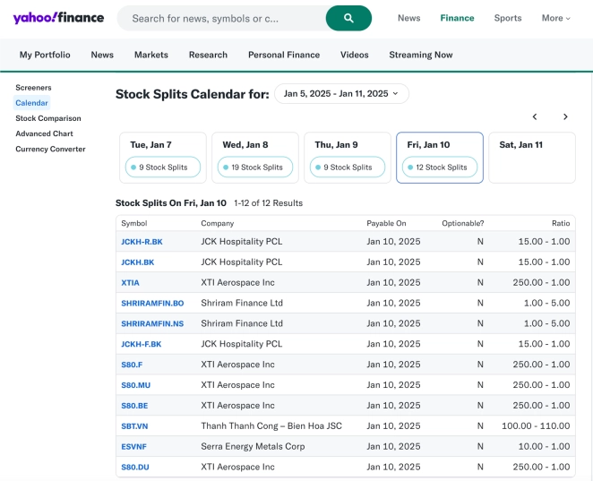 Узнать о сплите обычно можно из нескольких источников. Если говорить про акции, то обычно такая информация публикуется в официальных пресс-релизах компании. Такие данные доступные на корпоративных сайтах (обычно в разделе “Investor Relations”) или в финансовых отчетах и других документах. Для отслеживания важных событий в мире классических рынков можно также использовать календари, например, Nasdaq Stock Splits Calendar или MarketBeat Split Calendar.