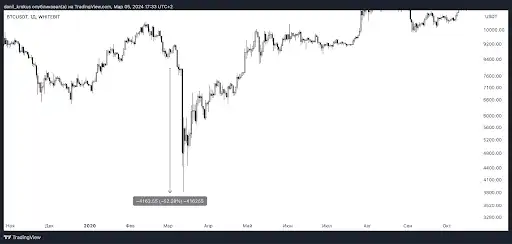 Теперь рассмотрим пример черного лебедя на крипторынках – так называемый черный четверг. Он вытекает именно из пандемии коронавируса. Черный четверг – это термин, используемый для обозначения резкого падения цен на криптовалюты, произошедшего 12 марта 2020 года. В этот день цена биткоина упала на 37%, а цена эфира – на 40%. Черный четверг был вызван сочетанием факторов, в том числе: