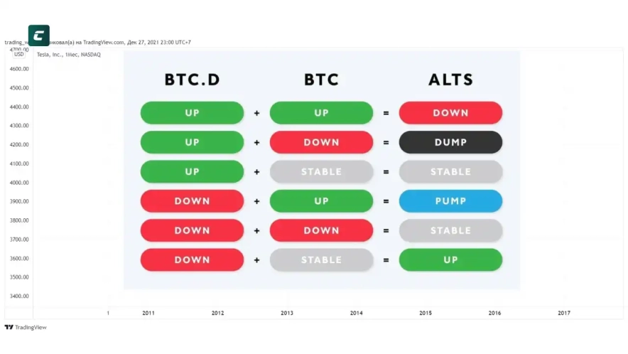 - Доминация BTC вниз + Цена BTC вверх = цена альткоинов вверх (памп).