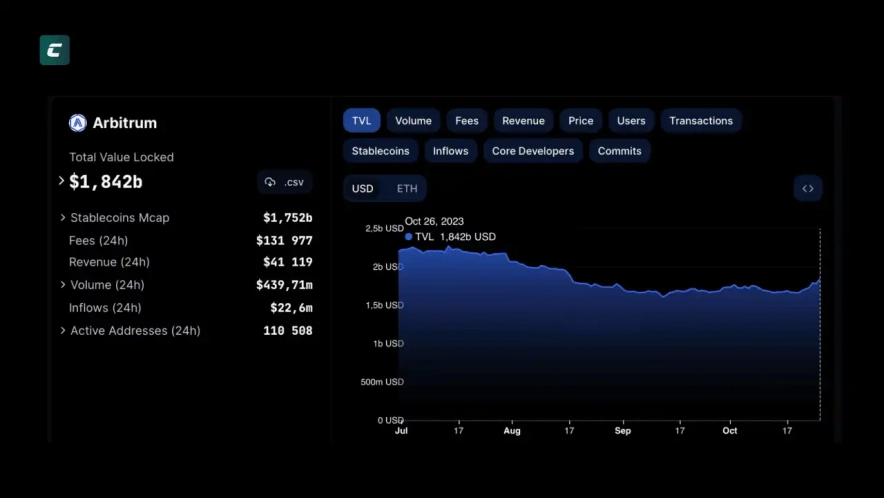 В первой половине 2022 года Arbitrum занял ведущую позицию среди L2-решений для Ethereum по количеству транзакций, разнообразию приложений и общему объему заблокированных средств (TVL). На текущий момент в смарт-контрактах Arbitrum заморожено более 1.842 миллиарда долларов.