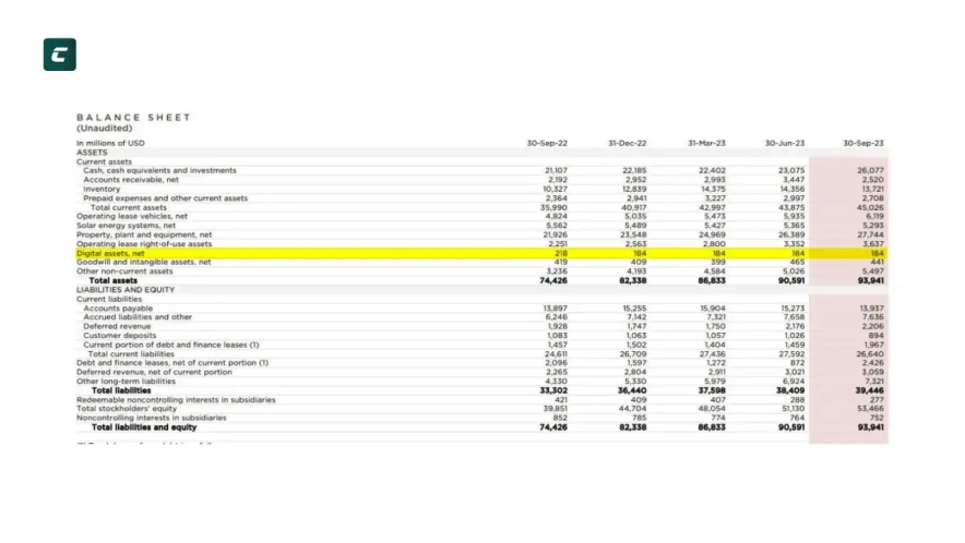 - Финансовые отчеты компаний (на рынке акций): изучение финансовых отчетов, таких как баланс, отчет о прибылях и убытках, и отчет о движении денежных средств компании, чтобы понять её финансовое состояние, рост прибыли и платежеспособность. Как правило, компании предоставляют финансовые отчеты раз в квартал. Например, в октябре 2023 года компания Tesla опубликовала финансовый отчет за третий квартал 2023 года. На нем мы, кстати, можем увидеть, что количество цифровых активов, удерживаемых компанией, не изменилось за 2023 год.