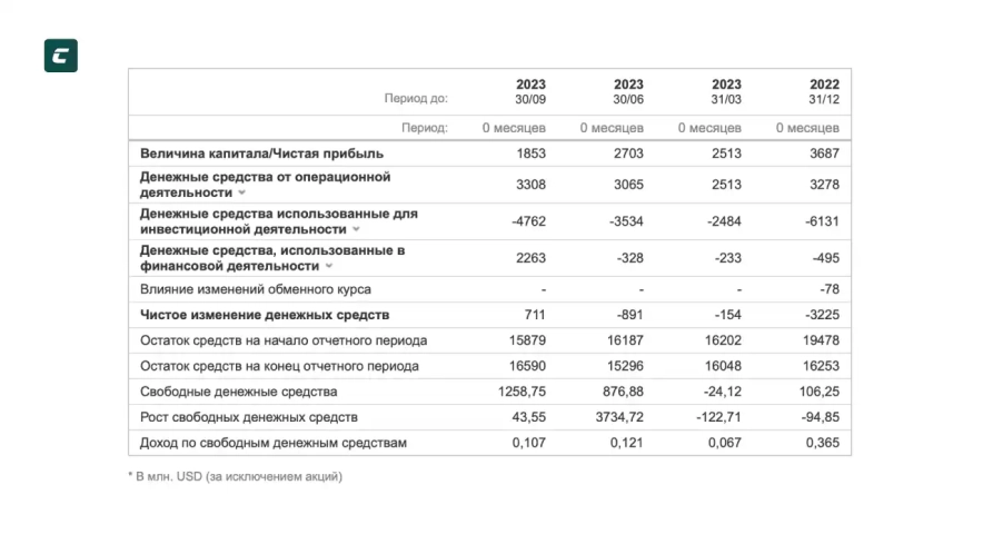 по состоянию на 30.09.2023 от операционной деятельности по последнему отчету компания получила 3.308 млрд. долларов, инвестиционная деятельность принесла компании убытки в размере 4.762 млрд. долларов, а от финансовой деятельности компания получила 2263 млн. долларов. Если подытожить эти цифры, мы увидим, что в целом компания получила 711 млн. долларов чистой прибыли при учете всех расходов.