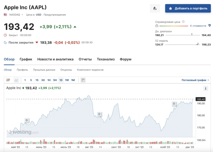 Оценка рыночной капитализации осуществляется с помощью умножения текущей цены актива на общее количество его в обращении. Формула выглядит так: рыночная капитализация = цена актива х количество актива в обращении. Рассчитаем для примера рыночную капитализацию компании Apple: