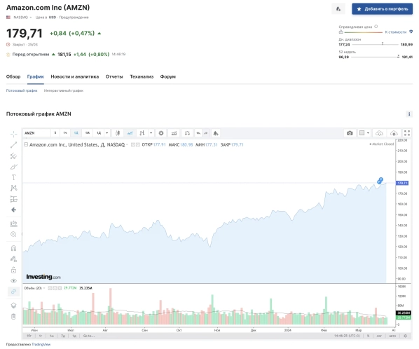 Рассмотрим на примере, всем известной на сегодняшний день, компании Amazon. В 1997 году акции компании стоили по 18 долларов США, рыночная капитализация была в районе 438 млн долларов США. На данный момент цена одной акции составляет 179.71$, а ее рыночная капитализация возросла до 1.87 трлн долларов США!