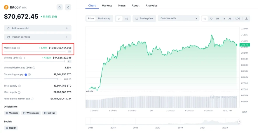 Например, рыночная капитализация BTC составляет $1,389,747,944,878. BTC является активом с наибольшей капитализацией среди других криптовалют.