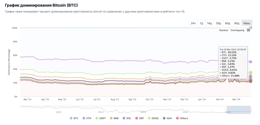 Доля BTC на данный момент составляет 49,55% в сравнении с другими криптоактивами. На втором месте законно располагается ETH с показателем 15.53%, а на третьем стейблкоин USDT от Tether – 3.75%.