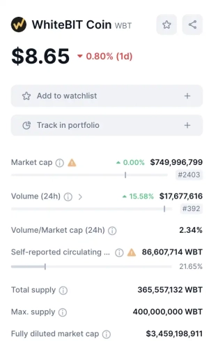 WBT Token – это утилитарный токен, выпущенный европейской криптовалютной биржей WhiteBIT. Он был выпущен в 2022 году и основан на блокчейне Ethereum. По состоянию на 14 марта 2024 года рыночная капитализация WBT Token составляет около 749$ млн. На данный момент цена токена составляет 8.65$ за монету.