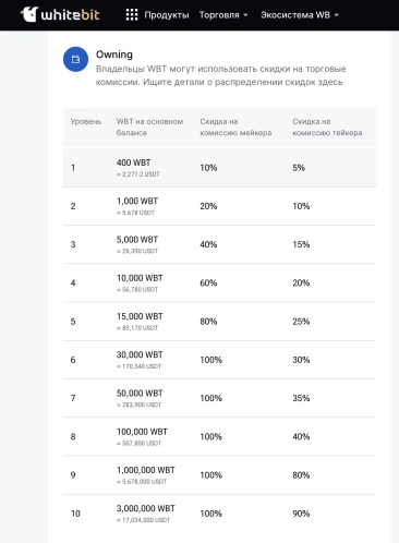 Владение токенами WhiteBIT дает пользователям до 90% скидки на комиссии за ордера тейкера и даже 100% на комиссии за ордера мейкера.