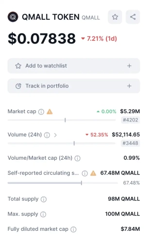 Токен QMALL представляет собой нативный актив биржи Qmall, созданный для использования во всех продуктах внутри экосистемы биржи. На данный момент цена QMALL составляет 0,07838$. Объем торгов токеном достиг 52114$. В обороте находится 67 миллионов QMALL, а рыночная капитализация этого токена составляет 5.29$ млн.