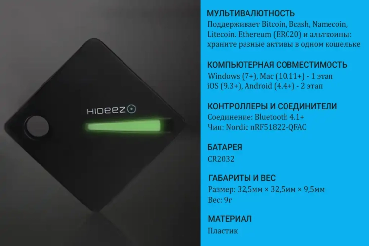 Hideez Group представила первый аппаратный кошелек для криптовалют в Украине – Hideez Wallet, основанный на технологии умного брелока Hideez Key. Hideez Key изначально был создан для хранения электронных сертификатов и ключей, именно его техническую базу использовали при разработке кошелька. Это устройство, совместимое с ПК и телефоном. Для подписи транзакций в кошельке встроена инновационная технология "Невидимый код" (Invisible Pin), работающая на основе уникальных комбинаций коротких и долгих нажатий на кнопки. Считается, что этот код практически невозможно подсмотреть и перехватить. Кроме того, приватный ключ можно копировать на разные устройства для дополнительного удобства.