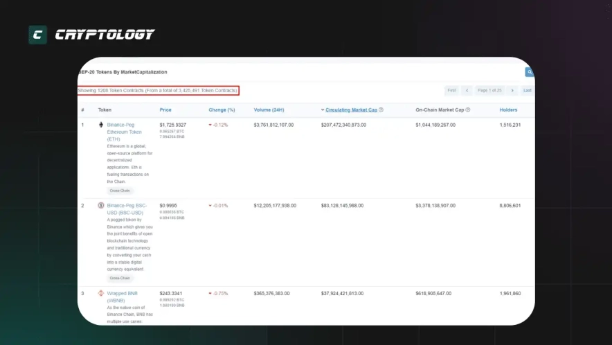 1208 основных токенов созданных на базе стандарта BEP-20 из 3,4 миллионов токенов.