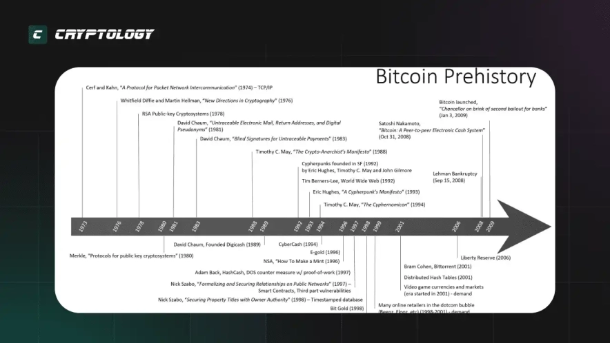 Долгое время концепция децентрализации обсуждалась небольшим кругом криптографов. В академических кругах велась активная работа по созданию технологий, способных воплотить ее в жизнь.