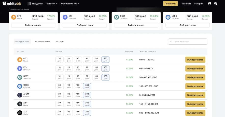 На бирже WhiteBIT в криптодепозитах представлено большое количество активов для инвестирования, а также очень выгодные тарифы, которые выигрывают у большинства других криптобирж. Кроме того, процент, который вы получаете от залоченных токенов, остается стабильным до конца выбранного срока вклада.