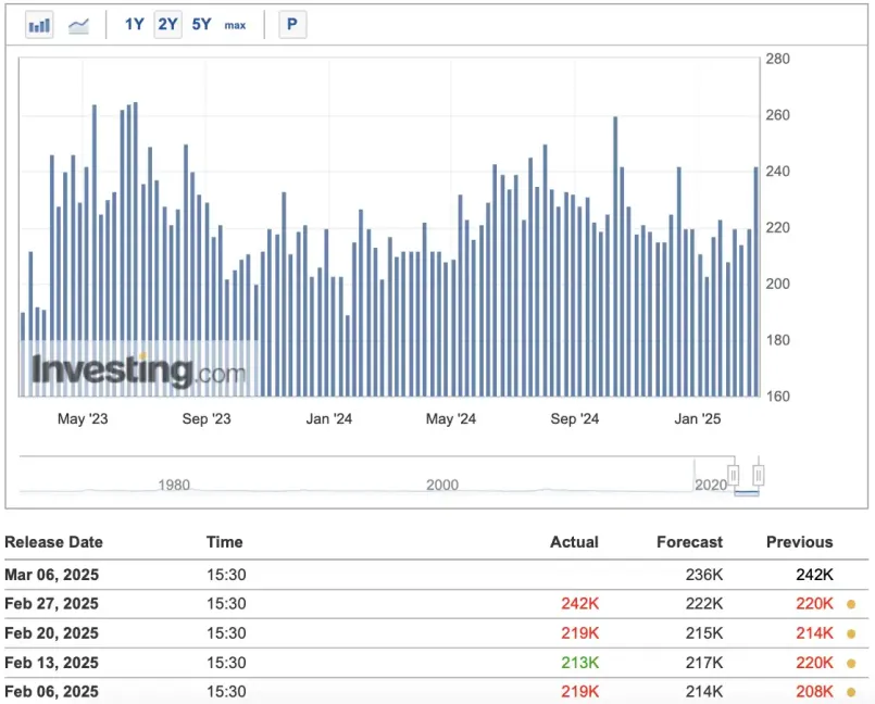 Еженедельный показатель о числе новых заявок на получение пособий по безработице. Рост заявок говорит о возможном ослаблении рынка труда. Показатель важен и отражаент состояние экономики, а также, может давать подсказки перед пятничным данными.