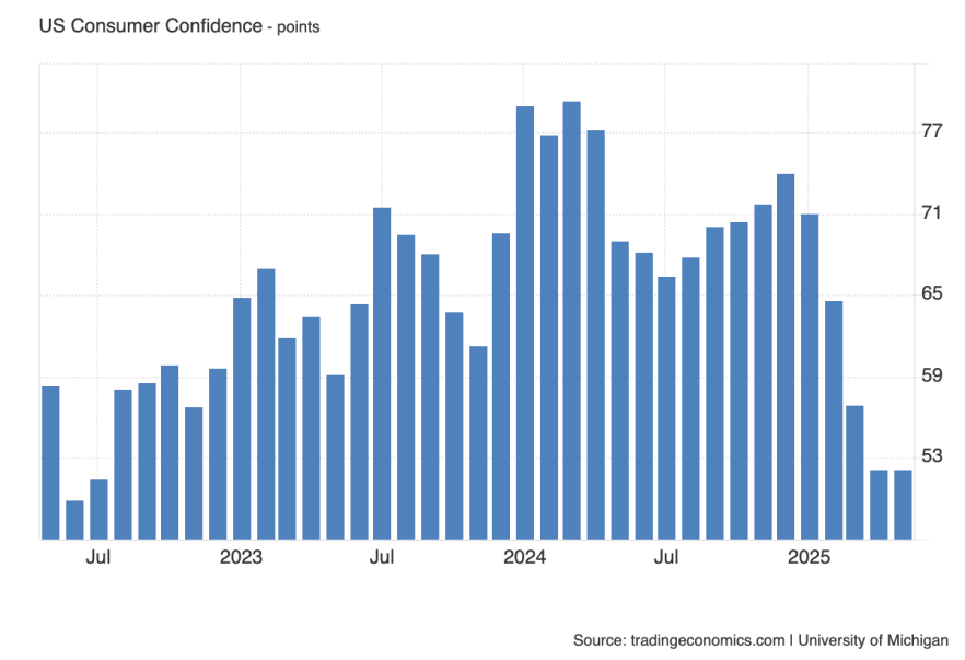 Индекс потребительского сентимента от Мичиганского университета продолжает демонстрировать слабость. Хотя тренд последних місяцев остаётся нисходящим, текущая оценка стабилизировалась — предыдущее значение составило 52.2, прогнозируется незначительное улучшение до 52.5.