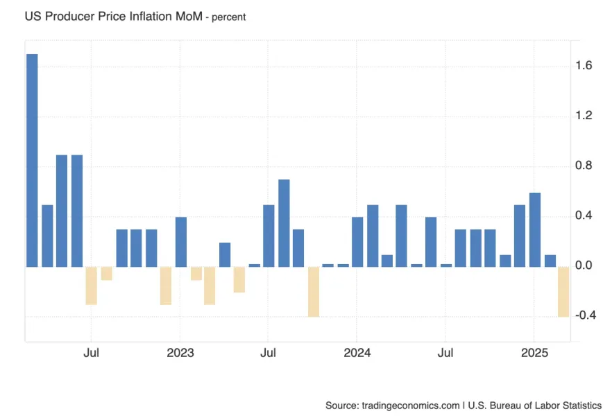 Месячная динамика индекса цен производителей (PPI) — важный ранний индикатор инфляционного давления на производственном уровне. После сильного снижения в марте (-0.4%), сейчас рынок ожидает восстановления до +0.2%, но картина неоднозначная.