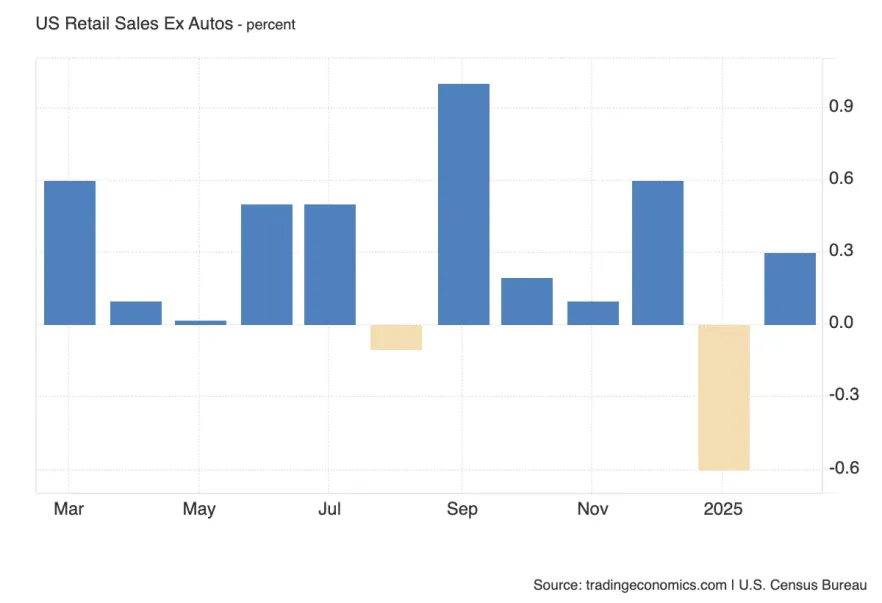 Core Retail Sales исключает продажи автомобилей, отражая более стабильную и чистую картину базового потребительского спроса. В отличие от общей метрики, здесь прогноз выглядит сдержанным и ближе к текущим экономическим реалиям.
