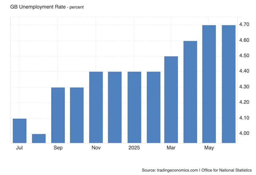 Уровень безработицы в Великобритании показывает долю людей, которые официально ищут работу и не могут её найти. Этот индикатор в сочетании с динамикой заработных плат формирует базовую картину состояния рынка труда. Если безработица растёт, это подтверждает охлаждение экономики и усиливает ожидания, что Банк Англии будет вынужден действовать мягче. Такой сигнал негативен для фунта и поддерживает цены на британские облигации. Если же безработица остаётся стабильной или снижается, это означает, что рынок труда по-прежнему устойчив, а значит давление на инфляцию сохраняется. В таком случае фунт может получить краткосрочную поддержку, а ожидания скорого снижения ставки будут отодвинуты.