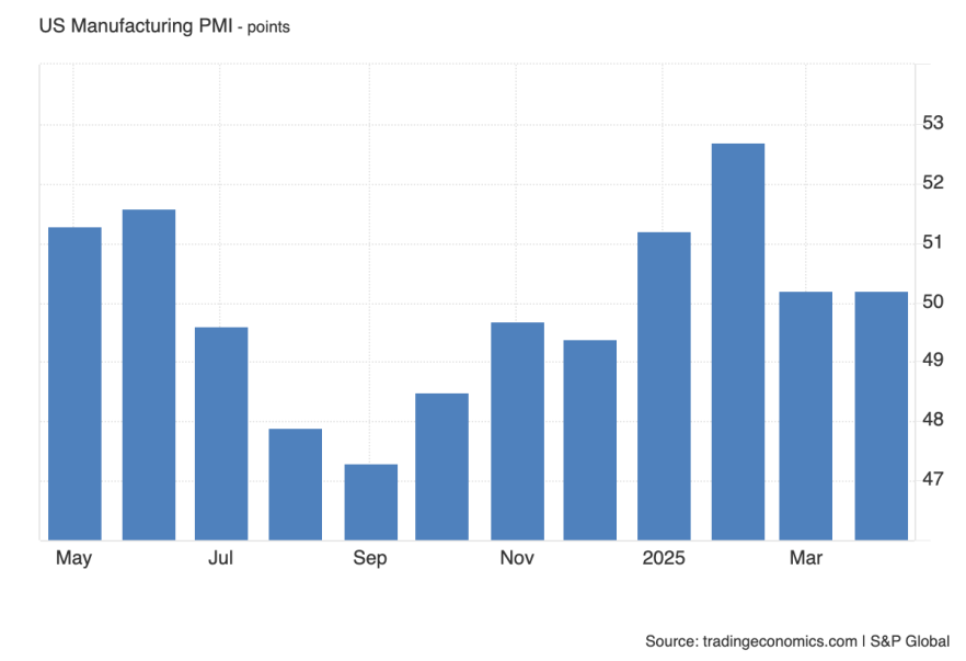Промышленный сектор США, согласно S&P Global, балансирует на грани нейтральной отметки 50. После кратковременного роста в начале весны, ожидания снова указывают на замедление активности.