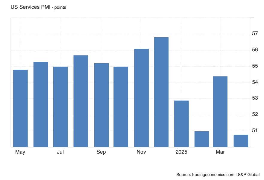 Сфера услуг в США, которая долгое время была локомотивом экономического роста, продолжает терять импульс. Последние два месяца индикатор уверенно снижался и вплотную подошёл к нейтральному уровню 50, что говорит о замедлении сектора.