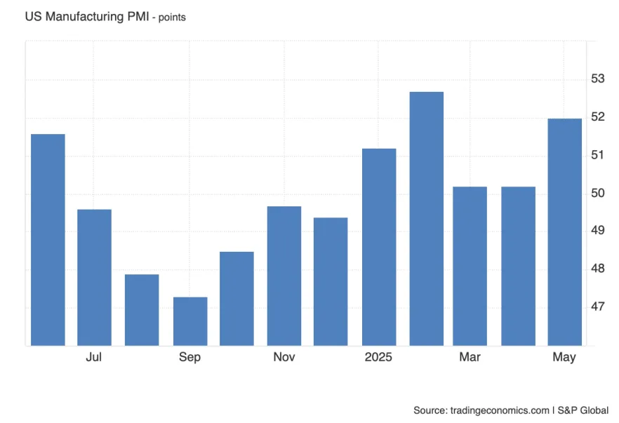 Американский производственный PMI в мае вырос до 51.1, оставаясь выше нейтральной отметки второй месяц подряд. Прогноз на июнь — 52.0, что сигнализирует о продолжении восстановления. Учитывая, что ФРС в своём последнем заявлении выразила обеспокоенность замедлением экономики, публикация этого индекса станет важным тестом для этих оценок. Значение выше ожиданий подтвердит устойчивость промышленного сектора и может вызвать рост доходностей казначейских облигаций, а также укрепление доллара. В то же время, слабый результат, особенно ниже 50, будет воспринят как ранний признак охлаждения, что поддержит более мягкие ожидания по ставке и окажет давление на доллар.