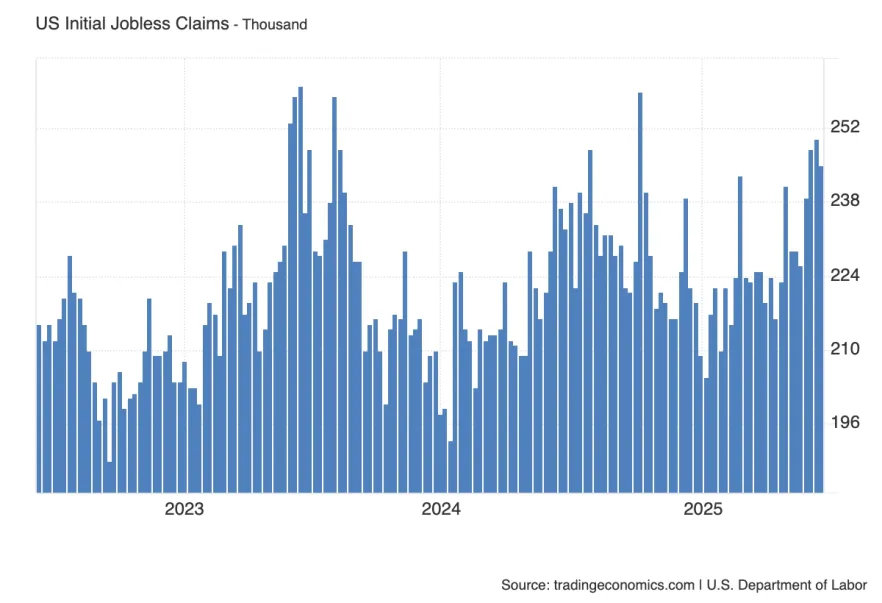 Показатель первичных заявок на пособие по безработице в США остаётся повышенным — уже несколько недель подряд значения превышают отметку 240 тысяч, что воспринимается рынком как сигнал ослабления рынка труда. На этой неделе ожидается публикация на уровне 245K при предыдущем значении 247K. Несмотря на незначительные колебания, сам уровень остаётся стабильно высоким по сравнению с началом року и периодами устойчивого экономического роста.