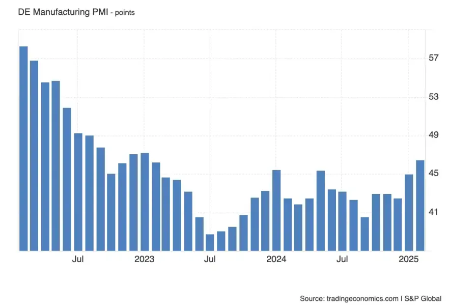 Немецкий флэш-индекс деловой активности в промышленности Германии (PMI) - важнейший индикатор состояния крупнейшего производственного сектора в еврозоне. Значение выше 50 указывает на расширение, ниже - на сокращение. Несмотря на то что индекс пока остается ниже отметки 50, в последние полгода наблюдается стабильная восходящая динамика, что может указывать на постепенное восстановление промышленности после длительного периода спада.