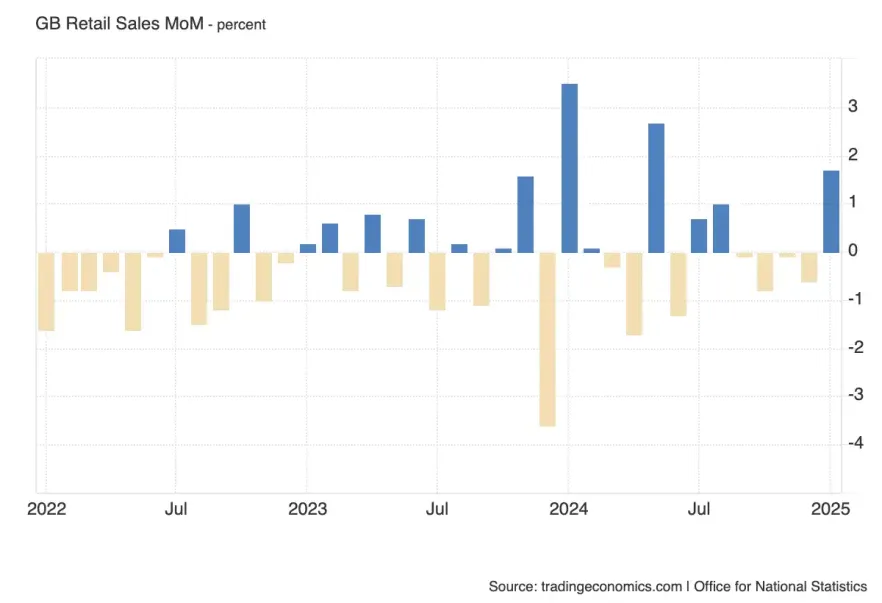 После сильного роста в январе (+1,7%), в феврале ожидается коррекционное снижение на -0.3% - это отражает общую слабость спроса, которая наблюдается не только в Великобритании, но и в других развитых экономиках, таких как США и Канада.