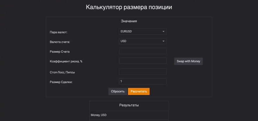 Для комфортного расчета позиции стоит воспользоваться калькулятором позиции на платформе MyFxBook. Теперь подробнее о его функционале.