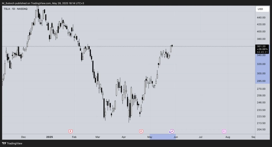 Несмотря на слабые квартальные результаты, акции Tesla демонстрируют рост. По состоянию на 28 мая 2025 года, стоимость акций достигла $361,29 (Yahoo Finance).