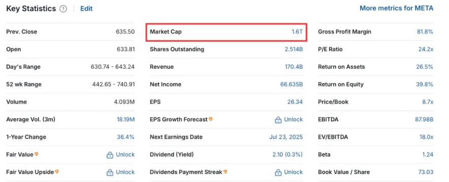 Рыночная капитализация Meta превышает $1,6 триллиона, что ставит ее в один ряд с Apple, Google (Alphabet) и Amazon.
