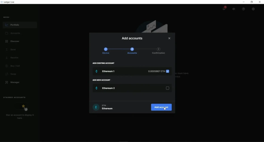 Перейдите во вкладку Accounts и нажмите Add account. Появится окно с подключением устройства. Подключите Ledger и введите PIN-код, чтобы разблокировать его.