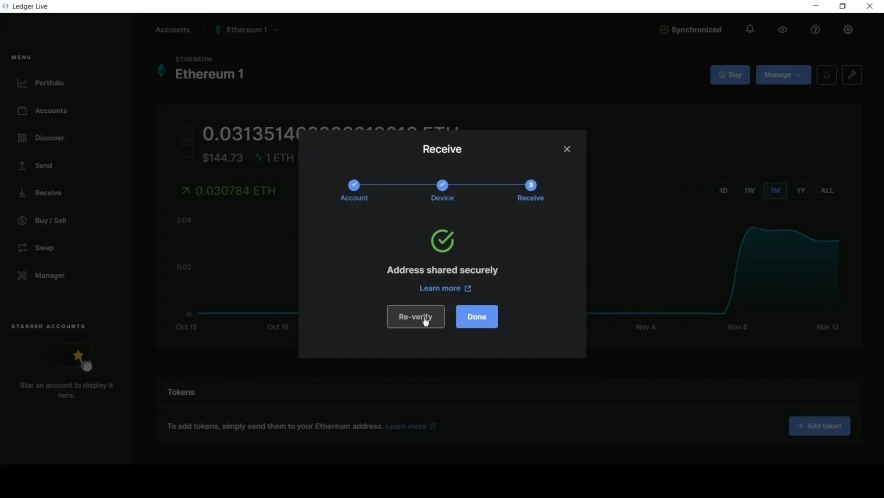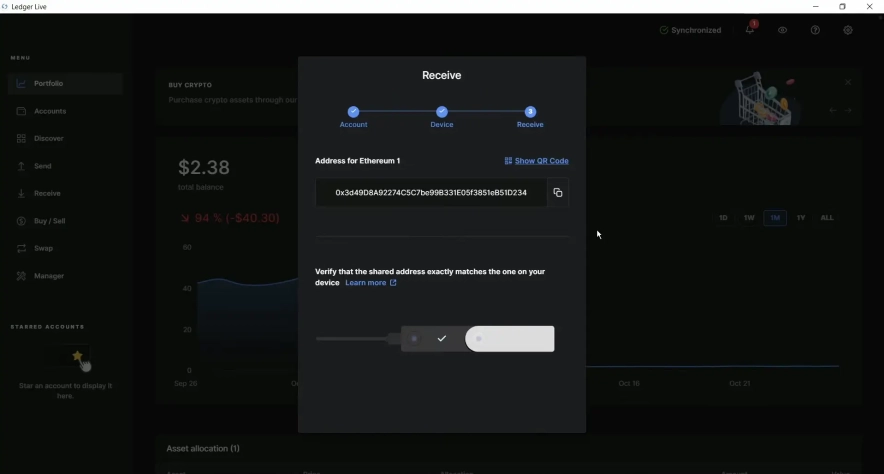 Ledger Live покажет адрес для приема монет. На вашем устройстве появится запрос для подтверждения.