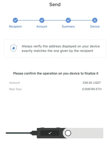 На экране кошелька появятся детали платежа. Обязательно сверьте первые и последние 4-6 символов адреса с тем, что в Ledger Live/на бирже. Если все совпадает - подтвердите операцию на устройстве.