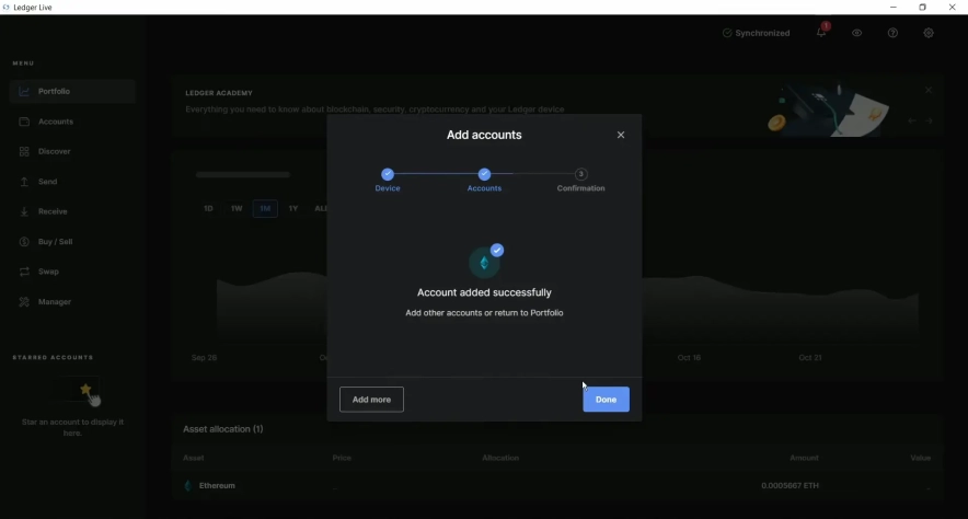 В Ledger Live появится сообщение Account added successfully. Теперь вы можете управлять этим аккаунтом: получать, отправлять монеты и просматривать баланс.